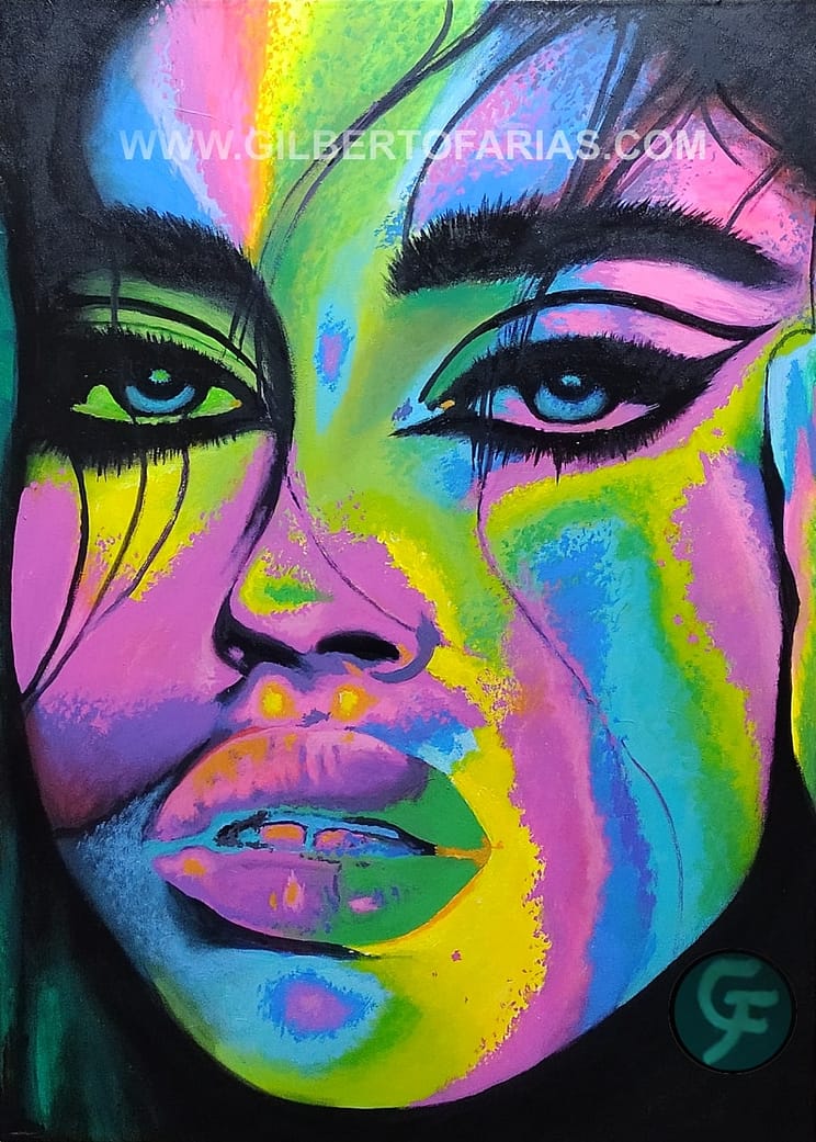 «Aura Cromática» es un retrato que captura la esencia de la energía y el color. La obra representa un rostro envuelto en un vibrante flujo de tonos fluorescentes, como si el estado de ánimo o el espíritu de la figura se manifestara en un aura visible. La mezcla de colores intensos y la técnica de goteo crean una sensación de movimiento y vitalidad. Con una mirada directa y penetrante, el cuadro invita al espectador a contemplar la belleza de las emociones en su forma más pura y luminosa.
