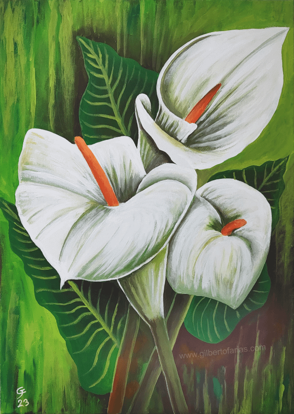 Una oda a la pureza formal y la elegancia botánica. «Calas» es una pieza de Realismo lírico que se enfoca en la belleza atemporal de las flores. La obra explora la interacción entre el blanco inmaculado de los pétalos y la luz sutil, utilizando el acrílico para construir una textura suave y un volumen casi escultórico. Es una composición tranquila y sofisticada, ideal para espacios que buscan serenidad y un toque clásico renovado.