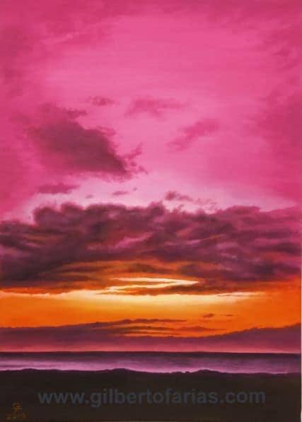 Un paisaje de alto contraste que evoca la fuerza y la belleza de la naturaleza indómita. Esta marina captura el instante dramático en que la luz del atardecer lucha contra la inminencia de la tormenta. La obra se caracteriza por el uso de pinceladas expresivas y una paleta cromática intensa en el cielo, contrastando con el realismo sereno del mar. Una pieza que no solo decora, sino que transporta al espectador a la intensidad y la emoción de un momento efímero en la costa.