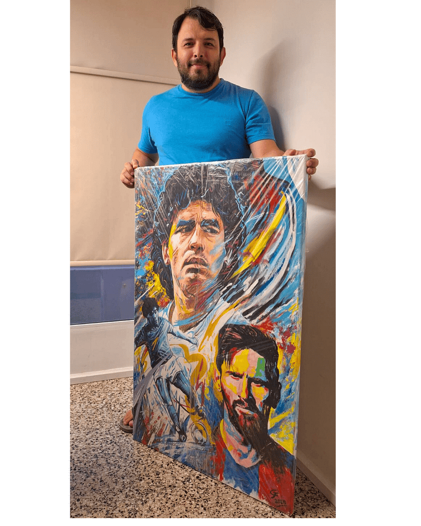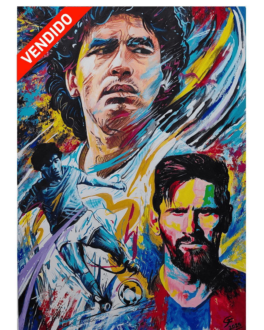 Esta obra plasma un poderoso encuentro entre dos generaciones de genios del fútbol. El título «D10s y Messias» simboliza la herencia de la grandeza argentina a través de los retratos de Diego Maradona y Lionel Messi. La composición vertical sitúa a las dos leyendas en un diálogo visual, uniendo el legado del pasado con el presente a través de un estilo vibrante y expresionista. La energía de la pieza se refleja en la audaz paleta de colores y las pinceladas dinámicas, que celebran la pasión y el espíritu de ambos íconos.
