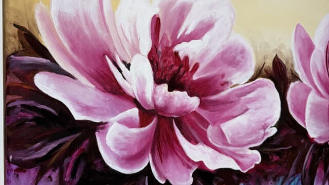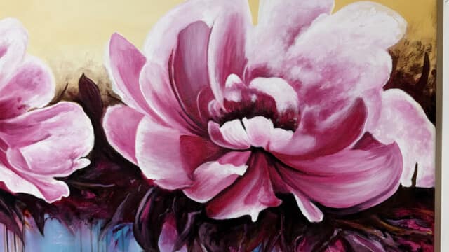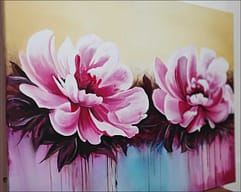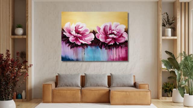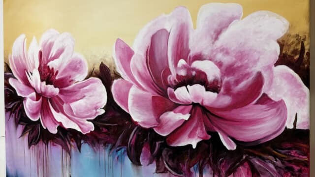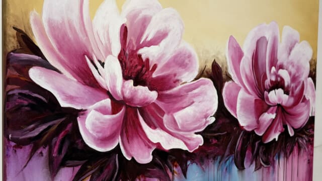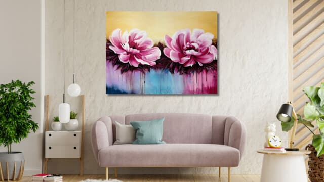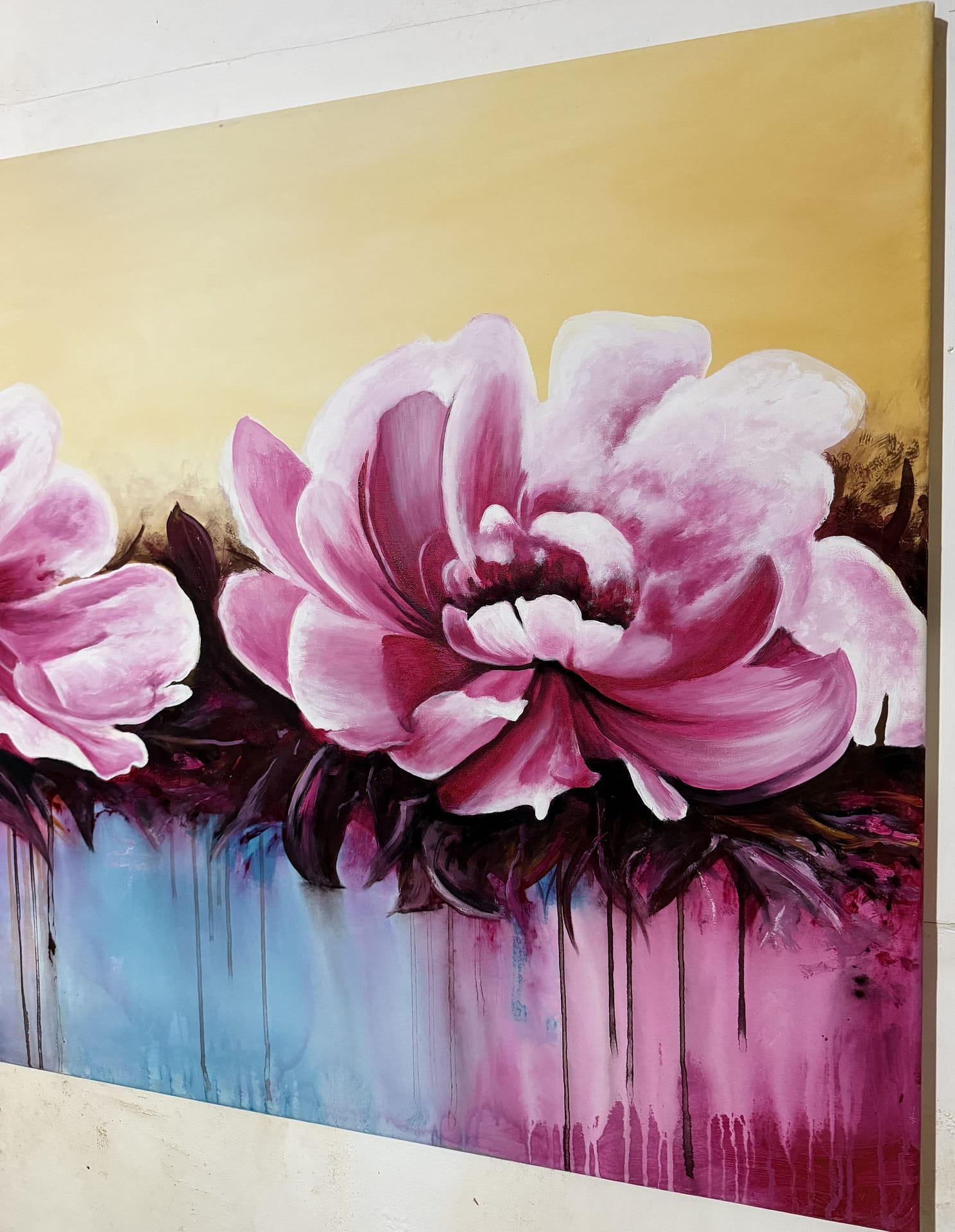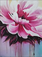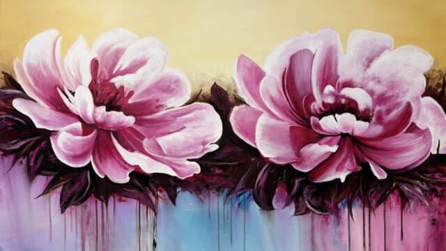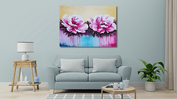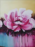 Esta obra vibrante presenta dos grandes floraciones en tonos fucsia y rosa intenso, capturadas con una energía dinámica. El fondo de tonos crema claro contrasta con la base cromática donde el azul turquesa y el púrpura se fusionan. Destaca la técnica de goteo y chorreo de pintura, que añade una sensación de movimiento y vida líquida, conectando el sujeto floral con el ambiente abstracto. Una pieza que celebra el color y el movimiento expresivo.